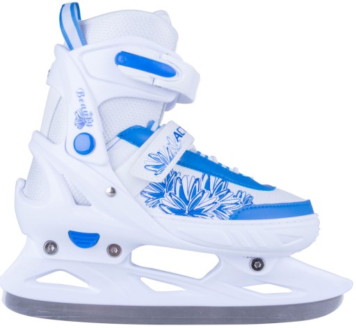 Damskie łyżwy regulowane Action Frio to nowoczesne łyżwy o atrakcyjnym, kobiecym designie. Kwiecista grafika i zimowa kolorystyka przypadną do gustu każdej dziewczynce i kobiecie. Dużym atutem jest łatwa regulacja rozmiaru za pomocą przycisku. Komfort użytkowania zapewnia miękka wyściółka wewnątrz buta - Comfort Fit, która pochłania pot, utrzymuje ciepło i pozwala stopom oddychać.