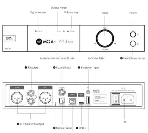 DAC-Z8 produkcji Eversolo to przetwornik cyfrowo-analogowy z przedwzmacniaczem i wzmacniaczem słuchawkowym oparty na XMOS XU316 oraz wydajnym układzie ES9038Pro. Konwertuje on każde z 4 wejść cyfrowych: USB-B, USB-C, koaksjalne, optyczne na analogowe w postaci symetrycznej na konektorach XLR lub niesymetrycznej na konektorach RCA zapewniając niezrównaną jakość dźwięku analogowego. Wyjście słuchawkowe 6,35mm obsługuje słuchawki o impedancji 16 – 300 Ω. Interfejsy wejściowe USB typu B (USB DAC) oraz USB typu C pozwalają na podłączenie komputerów, streamerów i urządzeń mobilnych. Moduł bluetooth Qualcomm QCC5125 obsługujący wersję 5.0 umożliwia dekodowanie dźwięku o wysokiej rozdzielczości (wsparcie formatów: SBC/AAC/aptX/aptX LL/aptX HD/LDAC).
