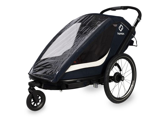 Zintegrowana osłona przeciwdeszczowa - pokrowiec przeciwdeszczowy jest umieszczony w tylnej kieszeni, już przymocowany do przyczepki za pomocą zamka błyskawicznego i można go szybko naciągnąć na przyczepkę, gdy nagle zaskoczy Cię deszcz.