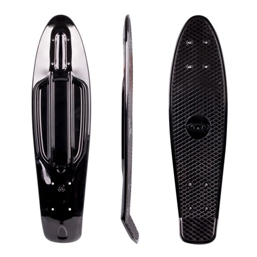 Polipropylenowa deskorolka typu kicktail, niepowtarzalny, błyszczący design, wytłoczona kratka zapobiegająca ślizganiu się, trwałe materiały.