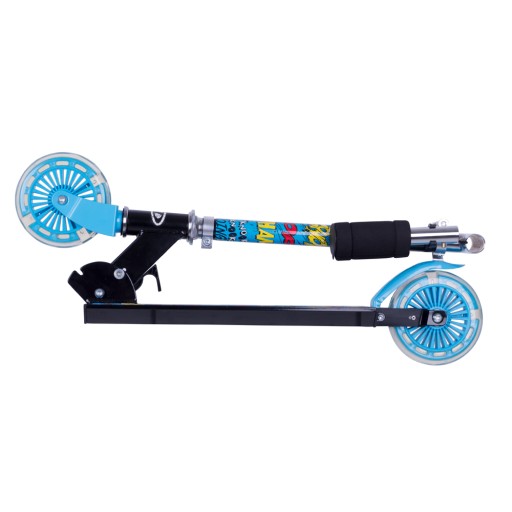 Efekt barwnej gry świateł z pewnością zachwyci każdego małego użytkownika! Dodatkowym atutem hulajnogi jest atrakcyjny, komiksowy design oraz szereg funkcji bezpieczeństwa: antypoślizgowy stopień, skuteczne hamulce i piankowe uchwyty przy kierownicy.