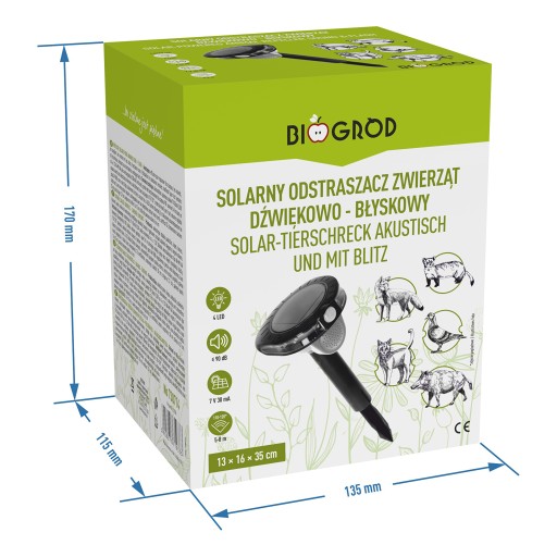- Bezpieczny dla ludzi oraz zwierząt - nie zakłóca funkcjonowania innych urządzeń solarnych i ultradźwiękowych, jest bezwonny. Fale dźwiękowe generowane przez odstraszacz działają na częstotliwościach, które są nieszkodliwe dla ludzi oraz domowych i hodowlanych zwierząt.