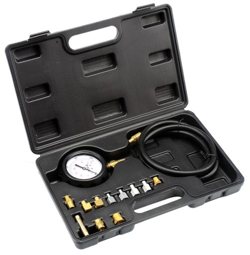 Profesjonalny miernik ciśnienia oleju. Dzięki zestawowi 12 redukcji możliwe jest zastosowanie miernika do większości typów silników.