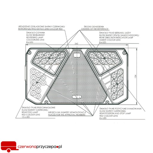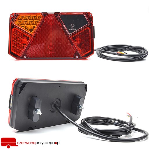 LEWA lampa zespolona z trójkątem odblaskowym LED - diodowa 12/24V (homologacja E20 na całą Europę - dopuszczona do ruchu), numer katalogowy CPL-W917. Polski producent - WAŚ. Lampa posiada 200cm przewód zasilający (5x0,75mm2). Soczyste kolory klosza dają doskonałe efekty świetlne. Lampa posiada wymienny klosz!!!, który również znajdziesz w naszych ofertach, symbol CPL-W931A.