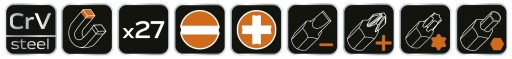 - bity: SL 4.5 mm, 6 mm, 7 mm; PH0, PH1, PH2, PH3; TORX: T10, T15, T20, T25, T27, T30, T40; H2, H3, H4, H5, H6