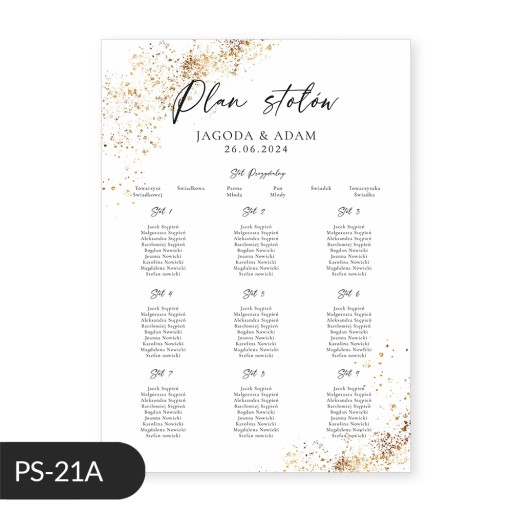Minimalistyczny plakat weselny z planem stołów i złotymi kropkami