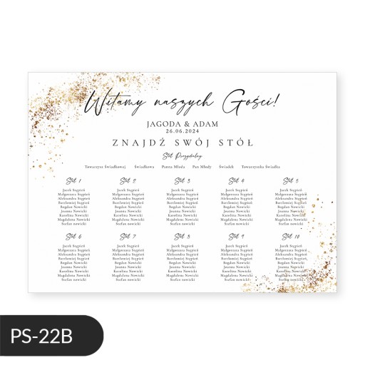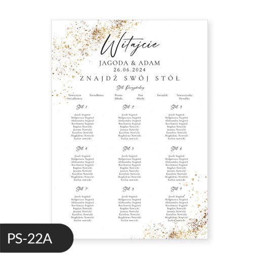 Plakat z planem stołów / spisem gości weselnych. Możliwość umieszczenia osobno Stołu Pary Młodej / Stołu Prezydialnego.