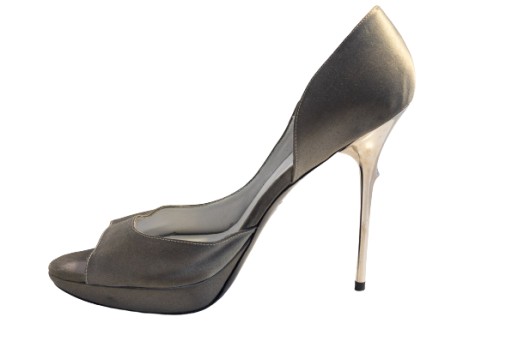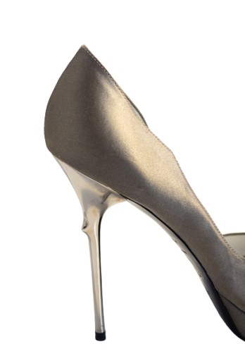 Luksusowe satynowe szpilki w szarym kolorze. charakterystyczny metalowy obcas. Skórzana wkładka.