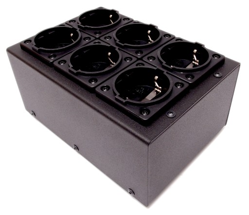Listwa zasilająca TAP6 wyposażona jest w 6 gniazd typu Schuko oraz gniazdo wejściowe typu IEC (6 gniazd z filtrami Schaffnera).