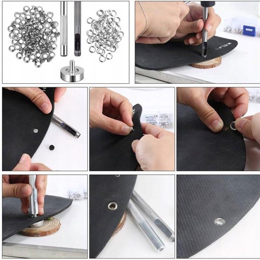 Trwały i łatwy w użyciu: Wykonany z wytrzymałego metalu wycinak do otworów i trzpień mogą służyć przez długi czas; Każdy komplet metalowego oczka i podkładki dobrze do siebie pasuje, nie pęka i łatwo się gubi.