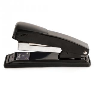 Zszywacz wykonany z metalu z wykończeniami z tworzywa sztucznego.