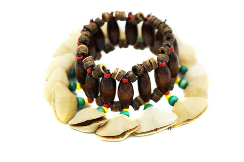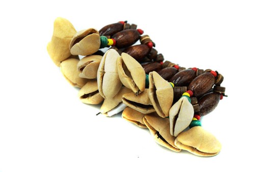 Bransoletki chas-chas to instrumenty perkusyjne, które można nosić na rękach lub nogach, a wydają dźwięki podczas potrząsania nimi. Są wykonane z nasiona kenari i drewnianych koralików, które są przewleczone na gumce. Orzechy kenari to naturalne materiały dźwiękowe , które mają wyraźny i jasny dźwięk. Rękodzieło Indonezja.
