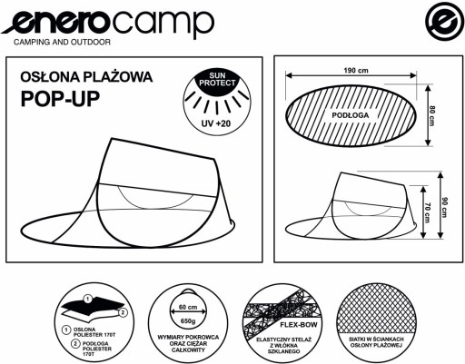 NAMIOTU PARAWANU PLAŻOWEGO SAMOROZKŁADAJĄCEGO SIĘ 190X80X90/70CM ENERO CAMP sprawdzi się podczas wszystkich Twoich wyjazdów nad morze, jezioro czy na biwak.