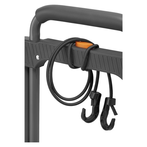 Na solidnej ramie znajduje się aluminiowa platforma o wymiarach 48,5 x 35 cm i udźwigu do 90 kg. Do zabezpieczenia ładunku służy dołączony pas.