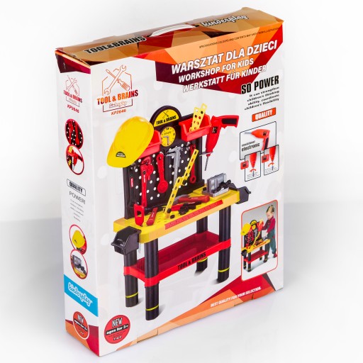 Stół warsztatowy z narzędziami to zestaw, który z pewnością zadowoli każdego małego majsterkowicza! W zestawie z warsztatem dzieci znajdą wiele akcesoriów (śrubki, nakrętki, wkrętaki itp..). Po włożeniu baterii do wiertarki i naciśnięciu przycisku wiertło kręci się jak w prawdziwej wiertarce! Zabawka zajmuje niewiele miejsca i jest łatwa w montażu / demontażu (przejrzysta instrukcja obsługi)