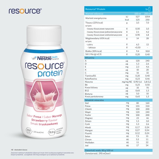 NESTLE RESOURCE PROTEIN specjalistyczny preparat odżywczy 16x200ml smak truskawkowy dla osób ze zwiększonym zapotrzebowaniem na białko