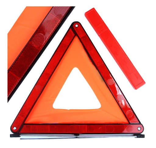 Obowiązkowe wyposażenie każdego samochodu. Składane trzy ramiona - długość ramienia 43 cm. Podstawa - rozkładany stojak z czterech podpórek, bardzo szybkie składanie i rozkładnie trójkąta.