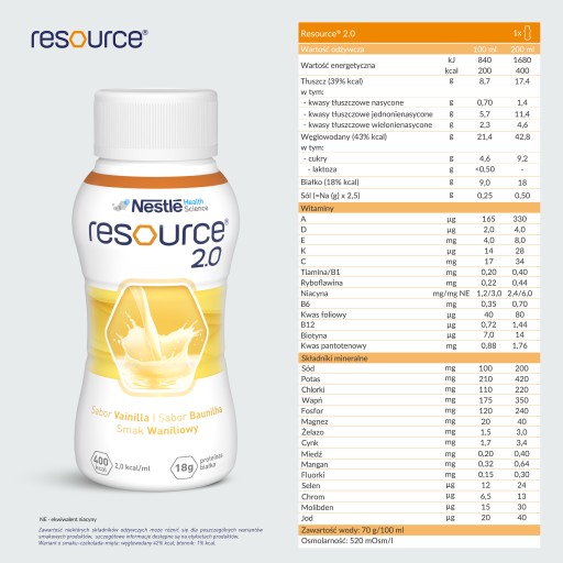 NESTLE RESOURCE 2.0 specjalistyczny preparat odżywczy 16x200ml smak waniliowy do walki z szybką i znaczną utratą masy ciała dedykowany osobom ze zwiększonym zapotrzebowaniem na energię i składniki odżywcze