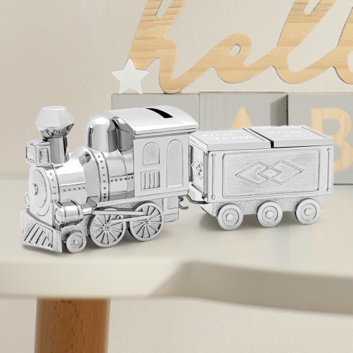 Elegancka skarbonka w kształcie pociągu to trafiony prezent na różnego typu okazje. Znakomicie sprawdzi się jako prezent dla dziecka z okazji urodzin lub Chrztu Świętego. Niewątpliwie stanowić będzie wyjątkową ozdobę wnętrza pokoju dziecięcego. Indywidualny grawer, który zamieścimy bezpośrednio na skarbonce, uczyni podarunek niepowtarzalną pamiątką na lata. Całość jest pokryta srebrną powłoką galwaniczną i polakierowana. Od spodu znajduje się zatyczka do wyjmowania pieniążków. W zestawie są również dwa wagoniki na pierwszy ząbek i pukiel włosów.