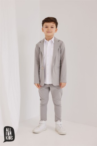 Elegancki szary garnitur dla chłopca. Marynarka jednorzędowa zapinana na guzik. Z przodu imitacja kieszonek. U dołu naszyte malutkie logo firmy. Spodnie w pasie na szerokiej gumie, po bokach i z tyłu kieszenie. Garnitur uszyty z tkaniny bawełnianej, miękkiej i elastycznej. Kolekcje te szyte są w krótkich seriach co sprawia, że są one wyjątkowe. Polski producent jakość premium.