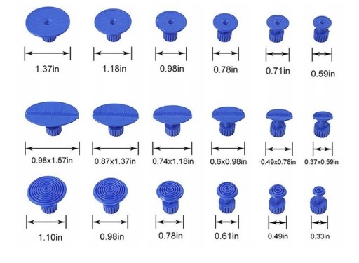 W zestawie jest 18 rożnej wielkości adapterów. Taki zestaw poradzi sobie z każdym wgnieceniem.