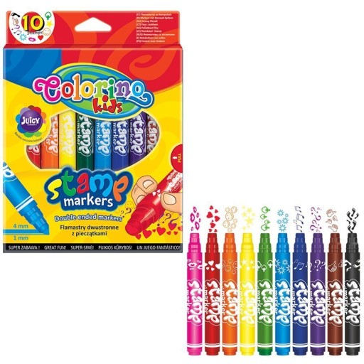 Dwustronne flamastry. Z jednej strony stożkowa końcówka do rysowania i pisania, z drugiej pieczątka. 10 soczystych kolorów – 10 różnych pieczątek. Idealne do ozdabiania zaproszeń, kartek okolicznościowych i laurek.