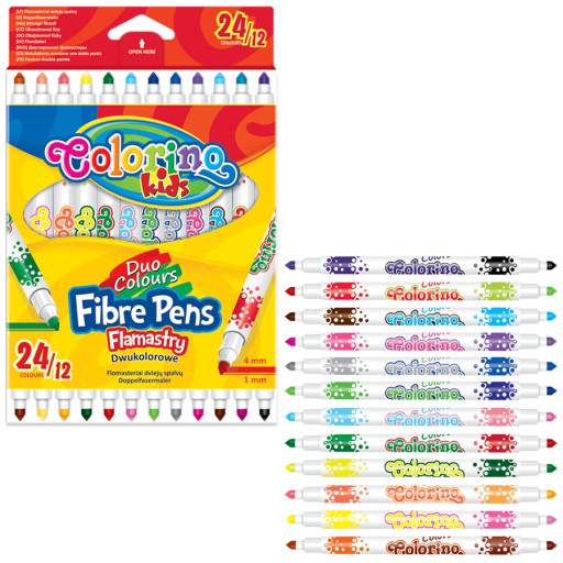 Zestaw 12 dwustronnych flamastrów marki Colorino to gwarancja podwójnej zabawy ! 12 flamastrów to aż 24 kolory do wyboru. Stożkowa końcówka pozwala narysować linie o dwóch grubościach: 1 lub 4 mm.