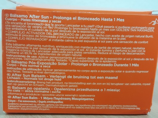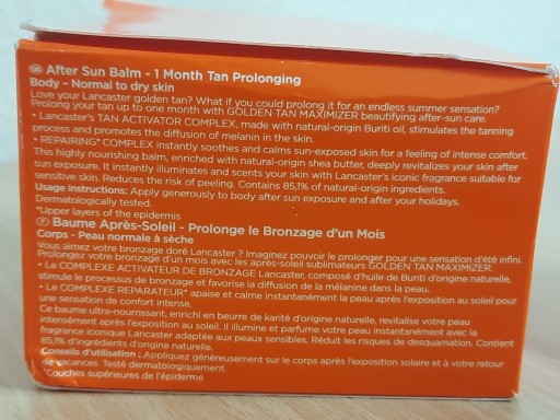 Uwielbiasz złotą opaleniznę Lancaster? Co jeśli mogłabyś ją przedłużyć, by uzyskać niekończące się uczucie lata? Golden Tan Maximizer Balsam po opalaniu przedłuża opaleniznę nawet o miesiąc i natychmiast uspokaja eksponowaną na słońce skórę. Kompleks Lancaster Tan Activator wzbogacony naturalnym olejem Buriti zwiększa produkcję melaniny dla uzyskania złotej, równomiernej i długotrwałej opalenizny. Ten wysoce odżywczy balsam po opalaniu zawiera kompleks naprawczy, który natychmiast koi skórę, zmniejsza ryzyko łuszczenia oraz pozostawia skórę jędrną i nawilżoną. Wzbogacony w naturalne, oryginalne masło shea, odżywia i rewitalizuje skórę po ekspozycji na słońce Natychmiast rozświetla i pozostawia na skórze kultowy zapach Lancaster, odpowiedni dla wrażliwej skóry.