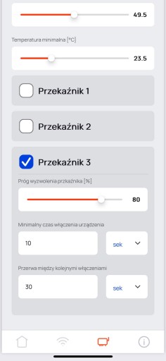 W trybach EKO i KOMFORT dodaliśmy obsługę przekaźników. Po przekroczeniu ustalonego przez użytkownika poziomu mocy grzałki na danej fazie, włączany jest przyporządkowany do niej przekaźnik (pierwszy przekaźnik odpowiada pierwszej fazie, drugi - drugiej, trzeci - trzeciej). Użytkownik ustawia minimalną długość trwania pracy danego przekaźnika, a także minimalną długość przerwy przed kolejnym włączeniem. Czasy te zapobiegają częstemu włączaniu i wyłączaniu podłączonego urządzenia, co mogłoby powodować uszkodzenia.
