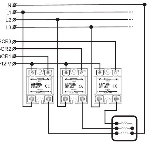 • część wykonawcza – wyposażona w trójfazowy regulator z wejściem analogowym (SCR – 25A) – zarządza obciążeniem podłączonego odbiornika,
