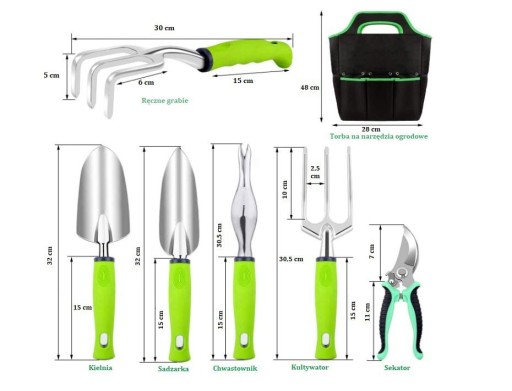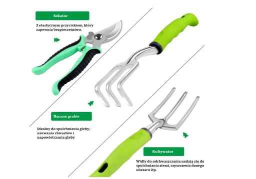 Zawiera torbę z kieszeniami, dzięki której narzędzia możesz swobodnie przenosić. Zestaw narzędzi ogrodowych idealny do szerokiej gamy zadań, np. pielenia, grabienia, przesadzania i przycinania. Oprócz klasycznych narzędzi w zestawie znajduje się również solidny sekator oraz opryskiwacz, rękawice z pazurami, które chronią dłonie przed skaleczeniem.