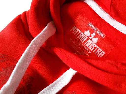 Intensywny czerwony kolor materiału w połączeniu z białym, dominującym napisem: Polska, wykonanym stylową, ale zarazem czytelną czcionką, to idealna propozycja dla każdej patriotki. Niżej znajduje się wymowne hasło "pamiętam skąd jestem", przypominające, że duma i poczucie narodowe jest niezależne od miejsca zamieszkania. Subtelnie zaznaczamy także bliski naszym sercom symbol orła w koronie, okraszonego kaligraficznym napisem z naszym firmowym hasłem: "Noszę Dumę".Nadruk z przodu wykonany jest dwoma kolorami farb, metodą sitodruku. Do jak najlepszego odwzorowania i intensywności bieli nałożone zostały 2 warstwy farby. Tło wzoru stanowi mix elementów, głównie symbolizujących nieodłączną dla polskiej tożsamości ludowość. Wykonane bordową farbą układają się w kształt serca, gustownie wtapiając się w kolor materiału, a także dodatkowo akcentując miłość do Ojczyzny.