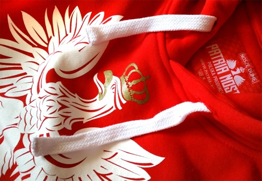 Nadruk z przodu wykonany jest mieszanymi metodami sitodruku. Dla dodatkowego wyróżnienia dumy polskiego, białego orła użyliśmy złotej farby (brokatowa) dającej efekt połysku. Do jak najlepszego odwzorowania i intensywności bieli postanowiliśmy nałożyć 2 warstwy farby.