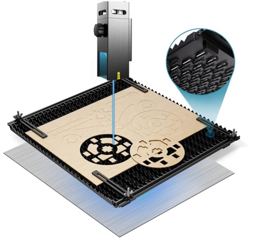 Płyta do cięcia F3 jest specjalnie wycinana do cięcia laserowego. W ramach ograniczenia panelu o linię plastra miodu, może wystąpić problem po dłuższym czasie użytkowania: tył wycinanego przedmiotu zostanie usunięty ślad plastra miodu, co wpłynie na wygląd pracy. Dodatkowo można uzyskać lepsze efekty cięcia, takie jak gładsze krawędzie cięcia, zbliżyć płytkę do płytki ATOMSTACK matrix.
