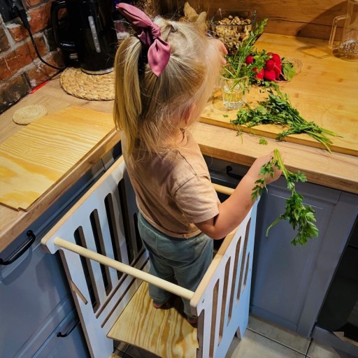- Kitchen helper pozwala w bezpieczny sposób rozwijać u dziecka samodzielność, twórczość oraz kreatywność podczas pracy w kuchni u boku rodzica. Jest to zgodne z filozofią Montessori, która jest wspólcześnie tak bardzo doceniana.