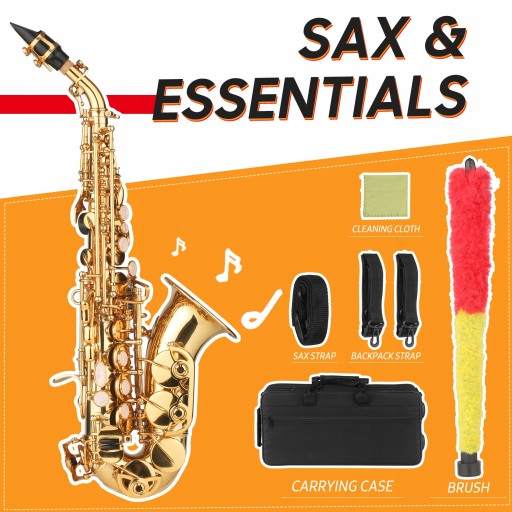 Saksofon sopranowy, lakierowany na złoto, elegancki, ładny, wykonany z mosiądzu, o chropowatej strukturze, kunsztownie wykonany: gładka linia smyczka w kształcie litery U zapewnia dobrą szczelność; skórzane nakładki i starannie wykonane klawisze dobrze ze sobą współpracują, pozwalając na łatwiejszą i lepszą grę. Ten instrument dęty wytwarza unikalne wysokie tony, zalecane dla studentów lub doświadczonych muzyków, do wykorzystania na scenie, pokazach ulicznych, występach solowych itp.