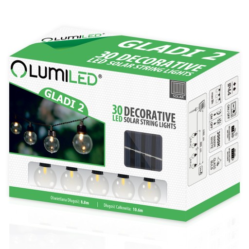 Girlanda łańcuch solarny GLADI 2 z trzydziestoma kulkami w kolorze transparentnym marki Lumiled. Girlanda solarna GLADI 2 to dekoracyjne, praktyczne i przyjazne oświetlenie Twojego ogrodu i środowiska.