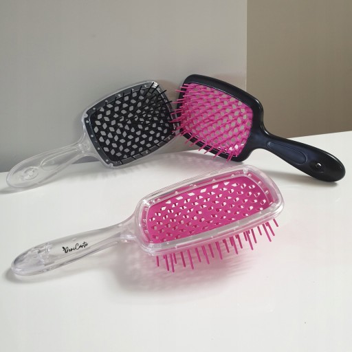 Doskonała szczotka do rozczesywania włosów. Specjalnie rozłożone niezwykle elastycznych ząbków umożliwiają szybkie i bezbolesne rozczesywanie włosów. Szczotka wyposażona została w elastyczną siateczkę, dzięki czemu dopasowuje się do kształtu głowy podczas czesania. Szczotka nie uszkadza struktury włosa dodatkowo masuje skórę głowy. Posiada ergonomiczną rękojeść, która wygodnie leży w dłoni, nie wyślizguje się. Szczotka nadaje się do rozczesywania włosów mokrych i suchych.