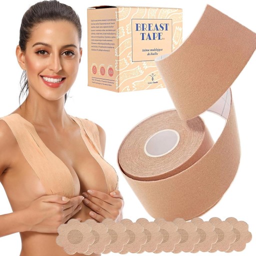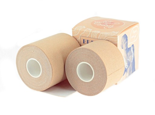 Body Ritual Breast Tape to beżowa taśma kinezjologiczna do unoszenia biustu pod dowolnym ubraniem. Taśma podnosi i podtrzymuje biust bez konieczności noszenia stanika. Z jednej strony przylega do skóry, a z drugiej jest miękkim, rozciągliwym materiałem niewidocznym pod materiałem. W każdym pudełku znajduje się 5 metrów taśmy oraz 10 satynowych nasutników w kształcie kwiatka.