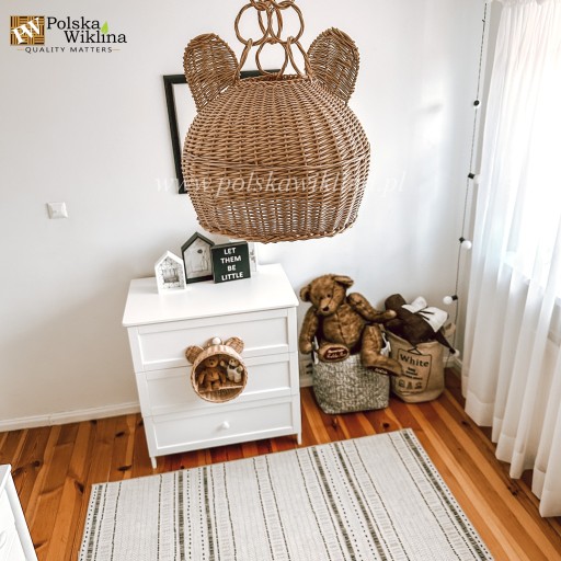 - Zastosowane: Abażur wiklinowy MIŚ stanowi idealne dopełnienie pokoju dziecięcego. Dobrze dobrany rozświetli i ozdobi przestrzeń, a także stworzy ciepłą oraz przytulną atmosferę w pomieszczeniu. Kolekcja produktów MISiak, na które składa się abażur, koszyczki ścienne, półki i legowiska dla pupili, idealnie sprawdzi się w pokoju dziecięcym zarówno chłopców, jak i dziewczynek.