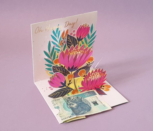 Kartka upominkowa z miejscem na włożenie prezentu dowolnej karty, wizytówki, bonu, karty kredytowej, odpowiednio złożonych pieniędzy
