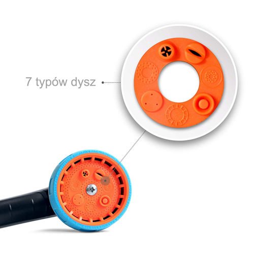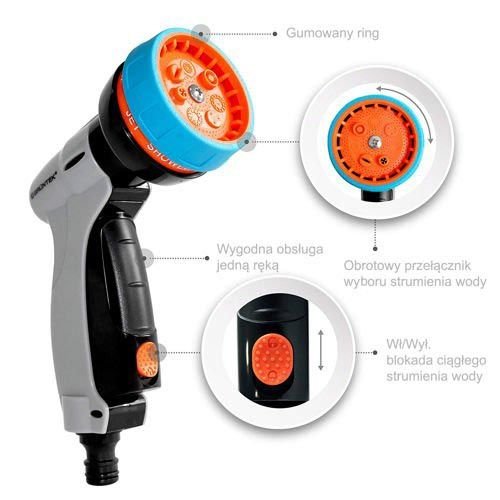Wielofunkcyjny, pistoletowy zraszacz ogrodowy Grüntek. 7 dysz zraszających