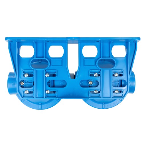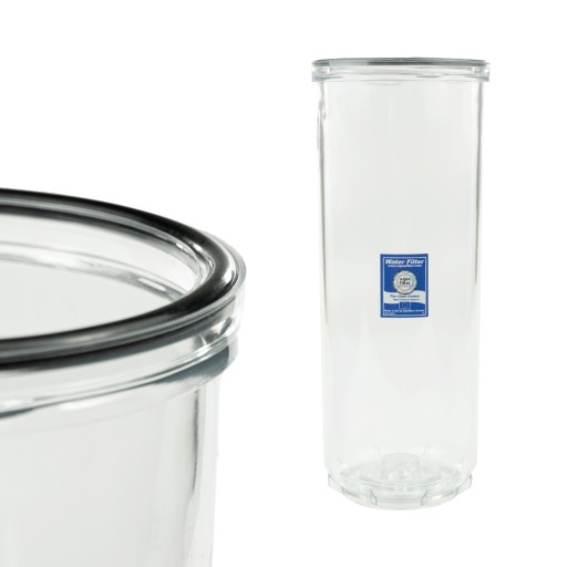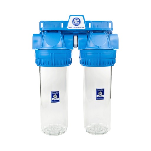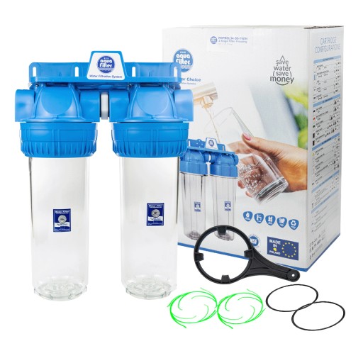 Zestaw składa się ze stelaża oraz dwóch przezroczystych korpusów na wkłady filtrujące o standardowych wymiarach 10x2,5 cala.