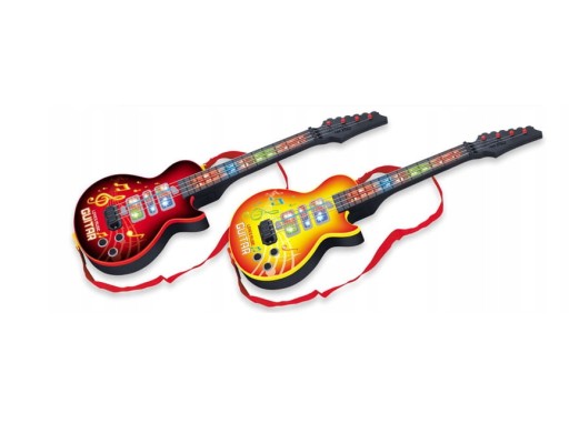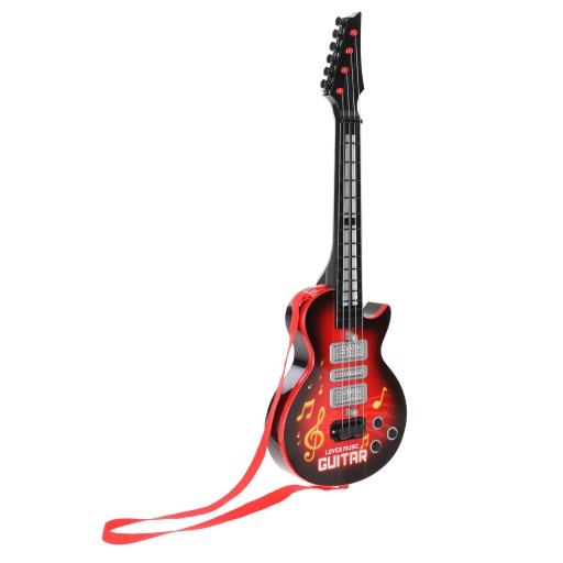 Gitara, mimo że jest tylko zabawką wygląda jak prawdziwy, zjawiskowy instrument. Z pewnością spodoba się każdemu dziecku, które marzy o tym aby w przyszłości stanąć na prawdziwej scenie muzycznej i zagrać własny koncert.
