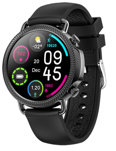 Smartwatch ma okrągły kształt z dwoma fizycznymi przyciskami. Ciekawego efektu dodaje kopercie pasek wykonany z tworzywa silikonowego. Jest przyjemny w dotyku i można go swobodnie regulować, posiada zapięcie, które jest bezpieczne i stabilne.