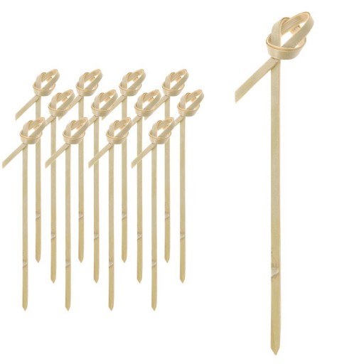 Patyczki do przekąsek o długości 9 cm. Zestaw zawiera 50 sztuk bambusowych wykałaczek. Zakończone pętelką, tak by nic się z nich nie zsunęło. Wykałaczki mają formę szpikulców, co ułatwi nabijanie produktów. Niezastąpione do serwowania przekąsek, koreczków i mini szaszłyków. Dzięki nim urozmaicisz przygotowanie menu podczas spotkań rodzinnych i biznesowych.