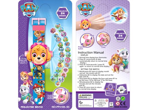 Zegarek posiada specjalny projektor do wyświetlania 24 obrazków z postaciami z bajki Psi Patrol.