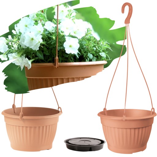Doniczka TERRA to okrągła wisząca doniczka balkonowa. Wyposażona w podstawkę z systemem samoblokującym z otworem ułatwiającym podlewanie. Wykonana z najwyższej jakości tworzywa sztucznego. Cechuje się odpornością na uszkodzenia i promienie UV. Klasyczny, okrągły kształt pozwoli Ci na doskonałą oprawę roślinności tarasowej, czy balkonowej.