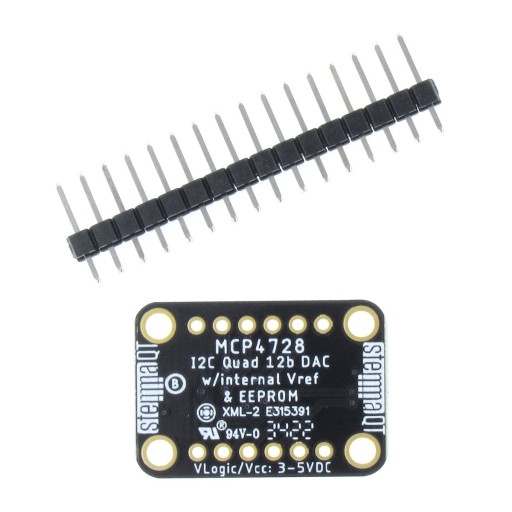 Moduł z 4-kanałowym konwerterem DAC MCP4728 o rozdzielczości 12-bitów. Ma wbudowaną pamięć EEPROM, w której użytkownik może przechowywać dane konfiguracyjne. Układ pozwala wybrać między dwoma źródłami napięcia odniesienia: napięciem wejściowym (na pinie VCC), lub wewnętrznym napięciem odniesienia 2,048 V. Przy użyciu wewnętrznego napięcia odniesienia (Vref), można skonfigurować wzmocnienie wyjścia 1X lub 2X, co daje zakres napięć od 0 V do 2,048 lub od 0 V do 4,096 V. Używając zewnętrznego napięcia odniesienia można dostosować zakres napięć do potrzeb projektu (od 0 do VCC). Moduł może współpracować z systemami o napięciu pracy 3,3 V lub 5 V, a komunikacja odbywa się przez interfejs I2C (złącze STEMMA QT). Pełna dokumentacja wraz z przykładami dostępne są na stronie produktu.