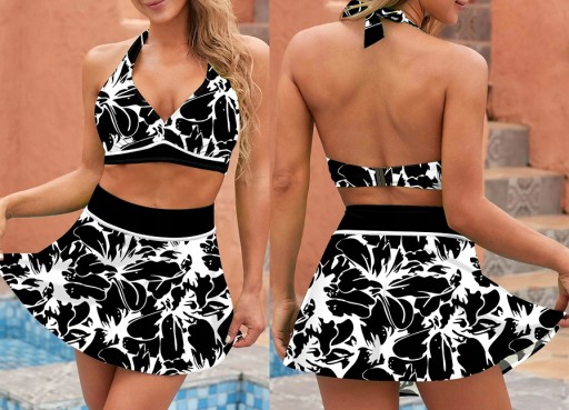 Modny od kilku sezonów dwuczęściowy strój z mixem wzorów, obecny na kostiumach kąpielowych, dzięki kolorowym printom przeniesie Cię na rajskie plaże i poczujesz letni klimat. Strój kąpielowy ze spódniczką, to idealne rozwiązanie, które pozwala podkreślić atuty kobiecego piękna, przy tym lekko korygując sylwetkę i maskując niedoskonałości. Fason z wkładką, bez fiszbin, podszyty stabilizującym materiałem pod biustem - daje możliwość dopasowania do różnych wielkości biustu. Kostium plażowy na nieco szerszych, rozciągliwych ramiączkach. Model posiada dwa wiązanie na szyi oraz dodatkowe zapięcie na plecach.